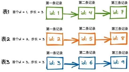 如上圖,每個表都有 不同的起始id和相同的步長 ,這就能保證業(yè)務(wù)記錄Id的唯一性。
