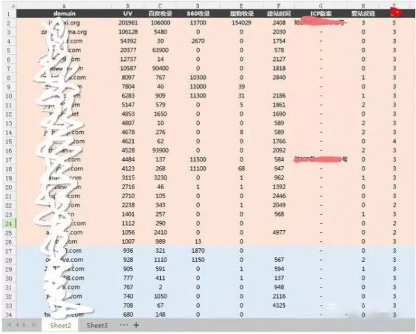 從統(tǒng)計(jì)工具里拿了這批域名,流量大頭的域名就那么20來個(gè),將部分指標(biāo)的絕對(duì)值拿出來