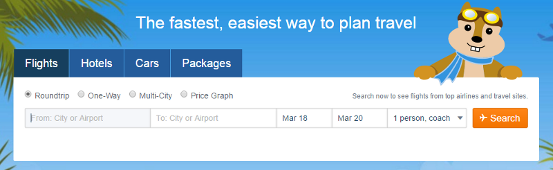 橙色是俏皮而樂觀的,非常適合于出現(xiàn)在休閑場(chǎng)所。不過(guò)對(duì)于企業(yè)而言,橙色并不是選的色彩,有研究顯示,橙色會(huì)給人一種廉價(jià)的感覺。不過(guò),Hipmunk 基于自身的配色方案很好的運(yùn)用了橙色。不論廉價(jià)與否,一個(gè)提示性效果明顯的CTA按鈕,在藍(lán)色白色為主的頁(yè)面中總是相當(dāng)顯眼的吧?
