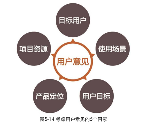 如何轉(zhuǎn)化為產(chǎn)品需求?需求的分析與篩選"中我們是綜合考慮哪些因素來分析需求的。考慮各種情況,我們最終細(xì)分出圖5-14中這5個(gè)具體因素,并分別舉例說明之。