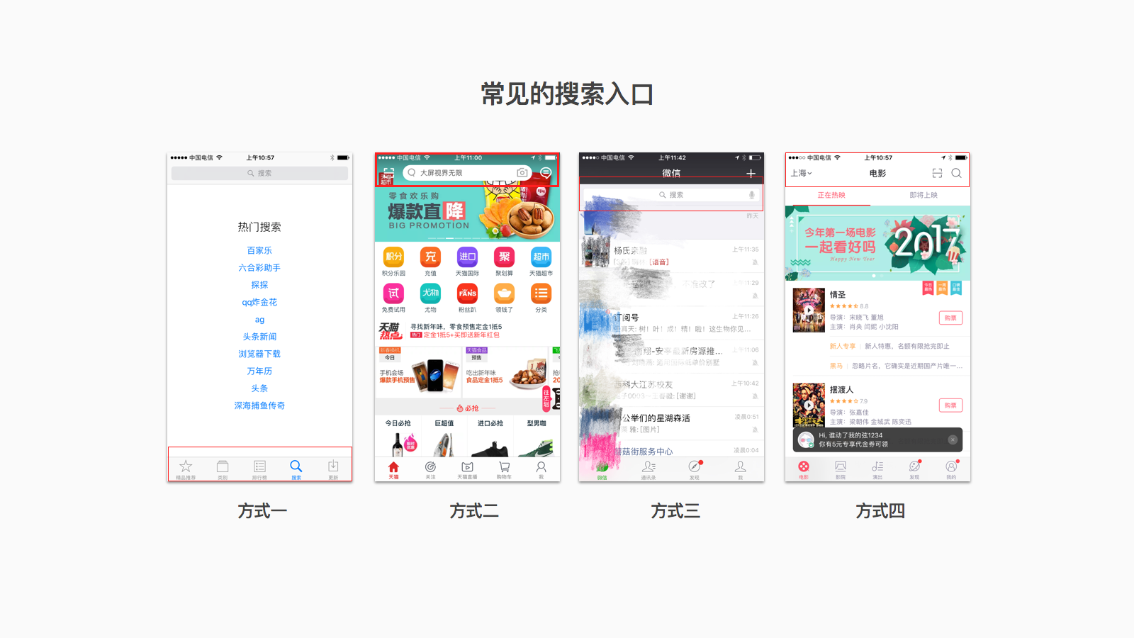 在不同的APP或者不同的場景下搜索入口有著不同的表現(xiàn)形式,具體的表現(xiàn)形式取決于產(chǎn)品對搜索功能權(quán)重的定義,如果說在某一場景下搜索功能是用戶常用的核心功能那么他在界面上所表現(xiàn)出來的權(quán)重就要高些,反之則低些。下圖是常見的搜索功能的入口形式,他們的權(quán)重從左到右依次降低,筆者將對他們一一進(jìn)行分析