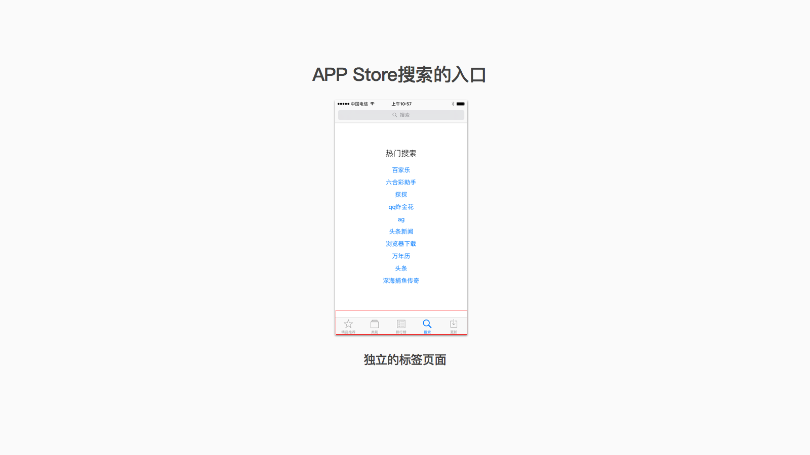 如下圖APP Store的搜索形式,搜索放在標(biāo)簽欄上作為一個獨立的功能模塊,它的功能層級是高的。不管用戶操作到哪里都可以隨時進(jìn)入搜索頁面,這樣的搜索入口通常用在搜索場景非常多的內(nèi)容型APP上,方便用戶在任何時候快速進(jìn)入搜索頁面。
