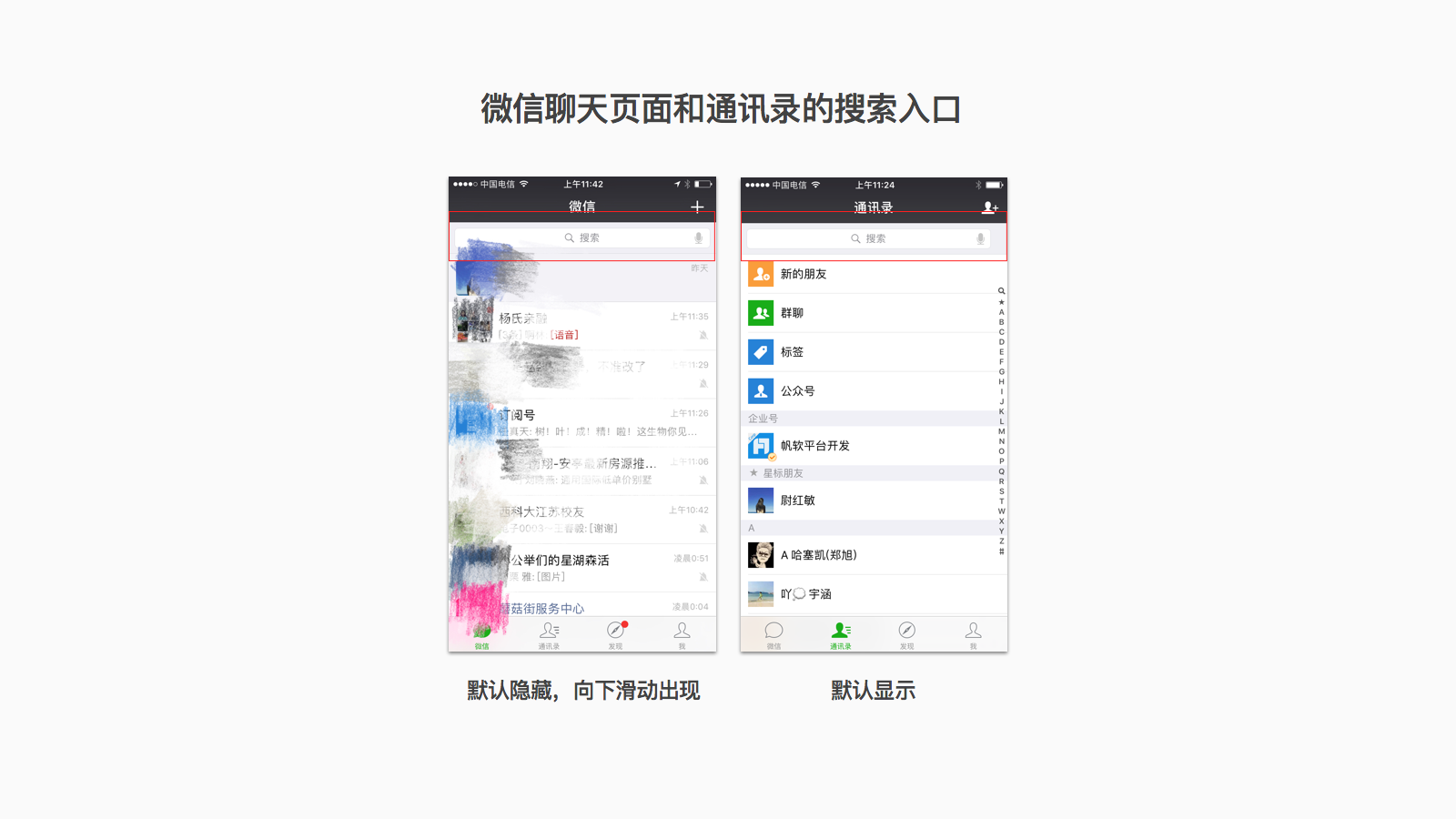 如下圖是微信在聊天頁面和通訊錄頁面的搜索入口,初始化狀態(tài)時聊天頁面的搜索框是不出現(xiàn)在用戶的可視范圍內(nèi)的,當(dāng)頁面下滑時搜索框才出現(xiàn),而在通訊錄頁面里搜索框是默認(rèn)出現(xiàn)在用戶的可視范圍內(nèi)的。