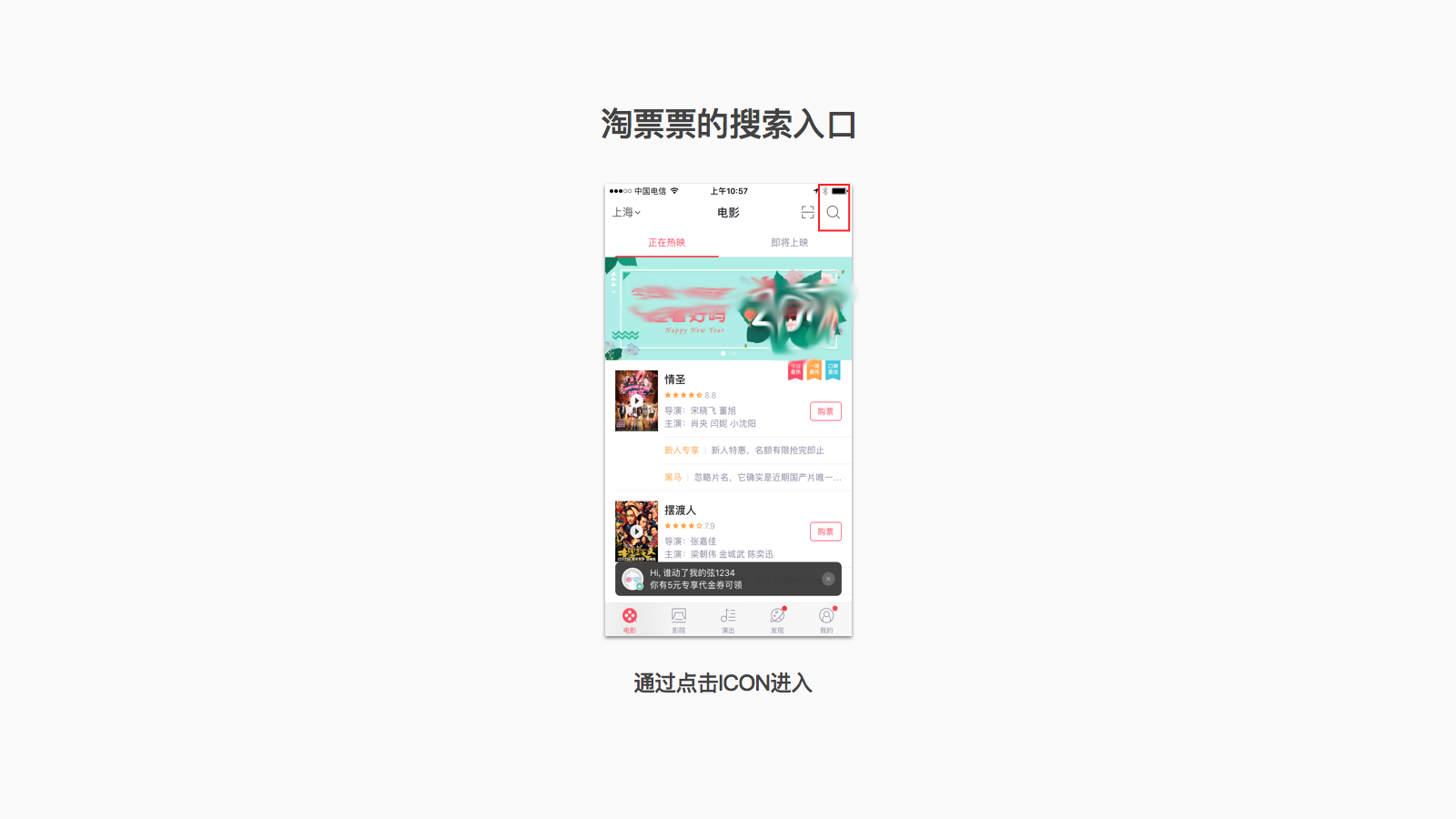 如下圖是淘票票的搜索的入口,通過點擊右上角的搜索icon進(jìn)入搜索頁面: