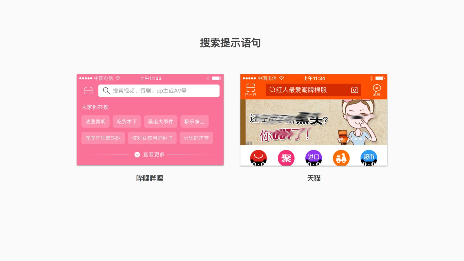 但隨著人們對APP使用的熟悉,用戶在這里的認(rèn)知負(fù)擔(dān)基本消除,運營人員逐漸搶占了這塊地方,這句話變成了內(nèi)容的推薦或者產(chǎn)品的Slogan,這些推薦的內(nèi)容可以是運營人員手動維護(hù)的也可以是依據(jù)用戶的購買和行為習(xí)慣進(jìn)行推薦的。如下圖右邊是淘寶的搜索提示,搜索框的文案變成了“紅人最愛潮牌名服”,這就是運營人員在為特定內(nèi)容進(jìn)行導(dǎo)流。