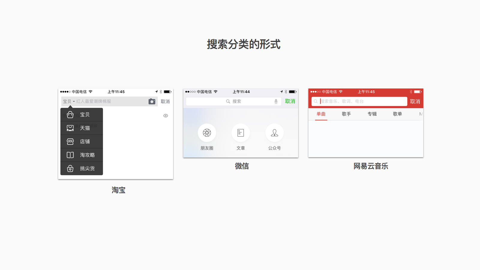 在內(nèi)容型APP中搜索時通常會對內(nèi)容進(jìn)行分類搜索,這是為了幫助用戶更精確地找到相關(guān)內(nèi)容,分類的操作可以發(fā)生在搜索前也可以發(fā)生在搜索后,如下圖是“淘寶、微信、網(wǎng)易云音樂”搜索分類的方式,筆者將分別對他們進(jìn)行分析。