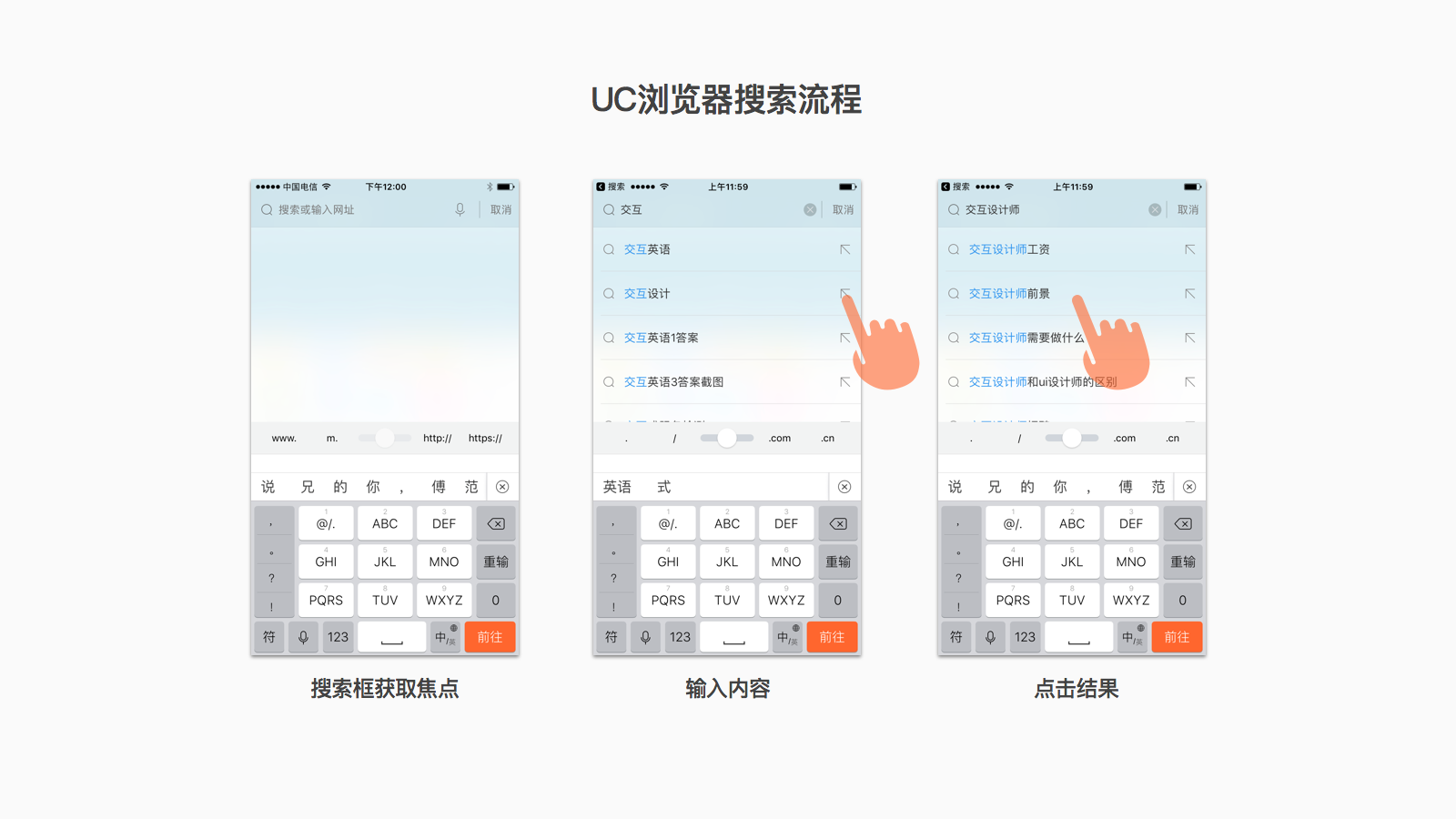關(guān)于輸入速度:很早之前偶然間發(fā)現(xiàn)了UC瀏覽器在輸入文字時的一個交互功能,如下圖所示,當(dāng)輸入文字后,用戶可以將搜索建議的詞語直接加入到搜索框中然后繼續(xù)輸入文字。這樣的需求場景在很常見,比如我想搜索“交互設(shè)計師的前景”,當(dāng)我輸入交互二字后就會有“交互設(shè)計”的搜索建議,點擊搜索建議后面的箭頭將這個詞直接加入搜索框,然后就出現(xiàn)了“交互設(shè)計師的前景”的搜索建議,點擊搜索建議后進(jìn)入搜索結(jié)果的頁面,這個過程中我少打了很多字,對我的搜索速度有很大的提升。