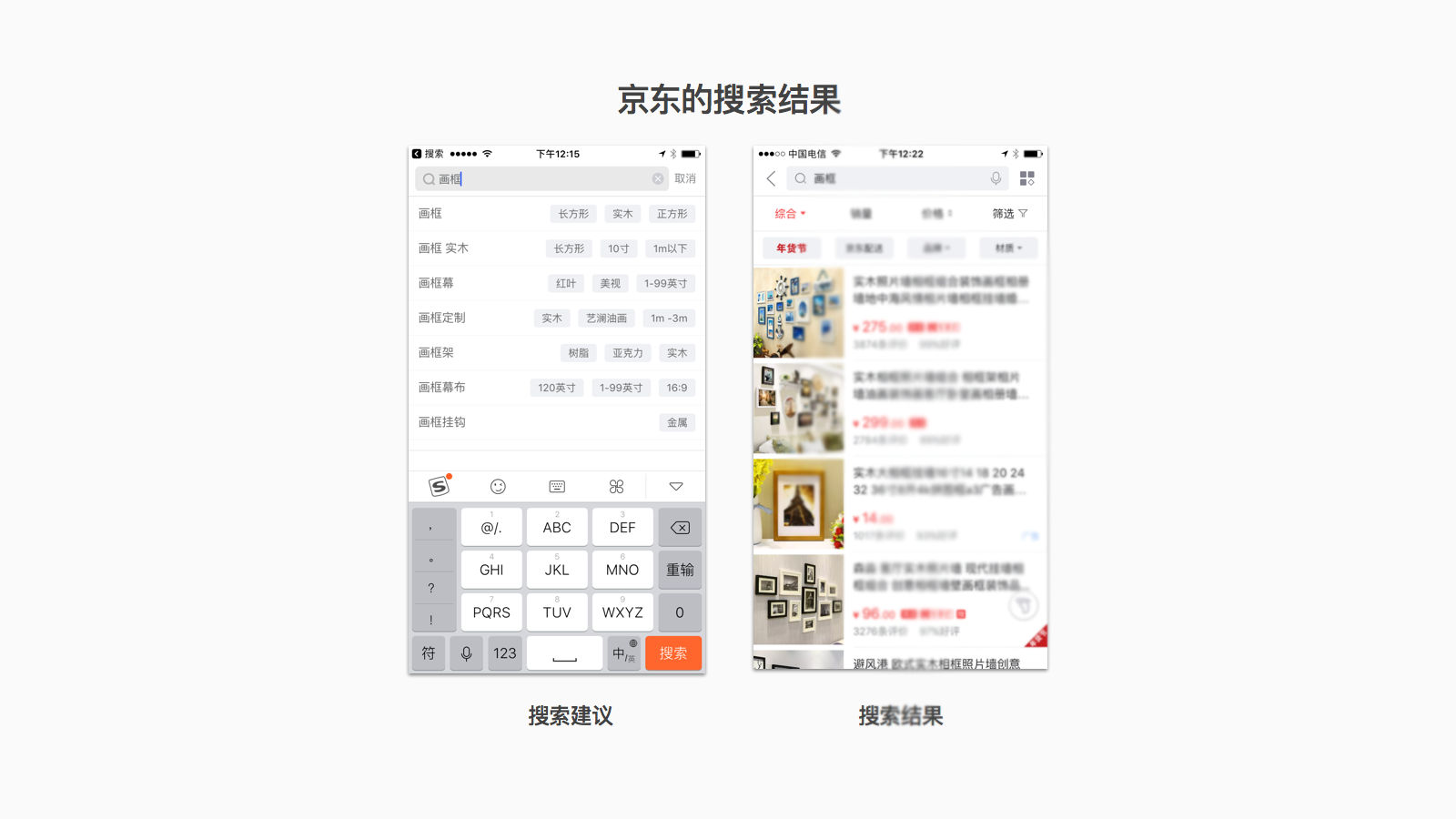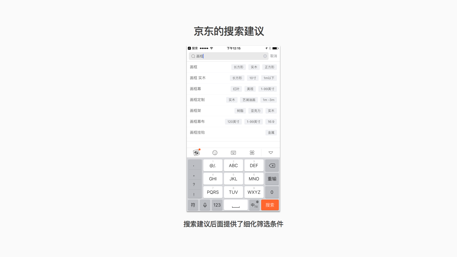 當(dāng)用戶輸入內(nèi)容后,搜索框下面出現(xiàn)了眾多的搜索建議,這些搜索建議是為了幫助用戶快速向目標(biāo)進(jìn)行轉(zhuǎn)化,如下圖是京東的搜索建議,當(dāng)我輸入畫框后,一系列畫框的搜索建議就出來了,它還有一個亮點就是在此提供了細(xì)化篩選條件,畫框后面緊跟了“長方形、實木、正方形”等關(guān)鍵的篩選條件,為用戶省去了到結(jié)果頁進(jìn)行篩選的步驟。