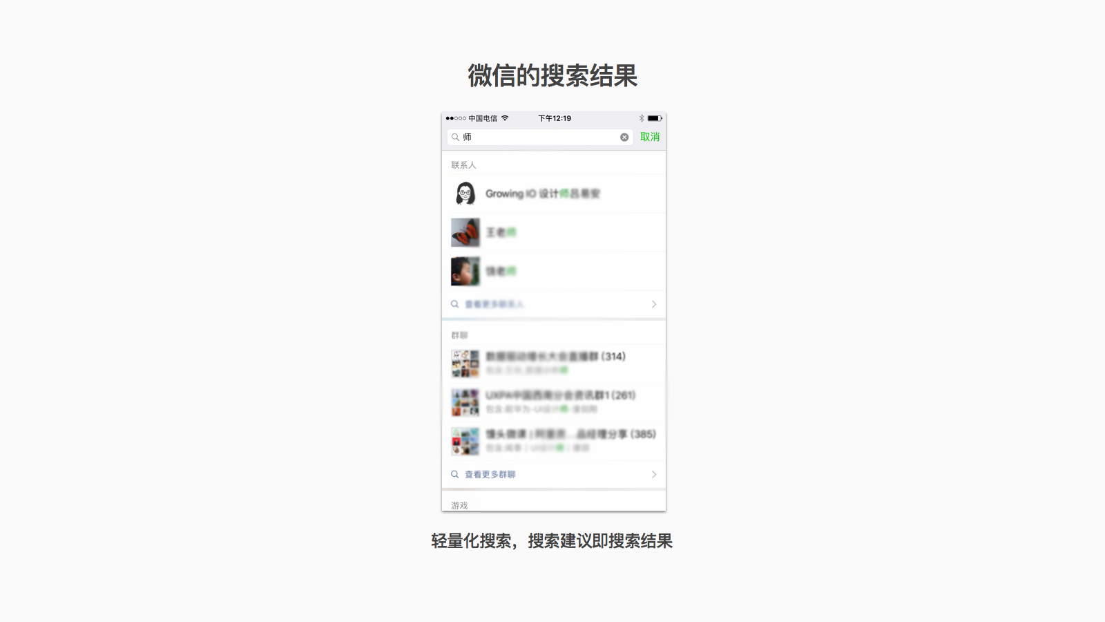 搜索結(jié)果一般分為兩種,一種是所見即所得,用戶輸入內(nèi)容后出現(xiàn)在搜索框下面的搜索建議就是搜索結(jié)果,這種搜索通常出現(xiàn)在一些輕量化的APP中,因為搜索建議對應(yīng)的就是唯一的搜索結(jié)果,如下圖微信的搜索一樣。
