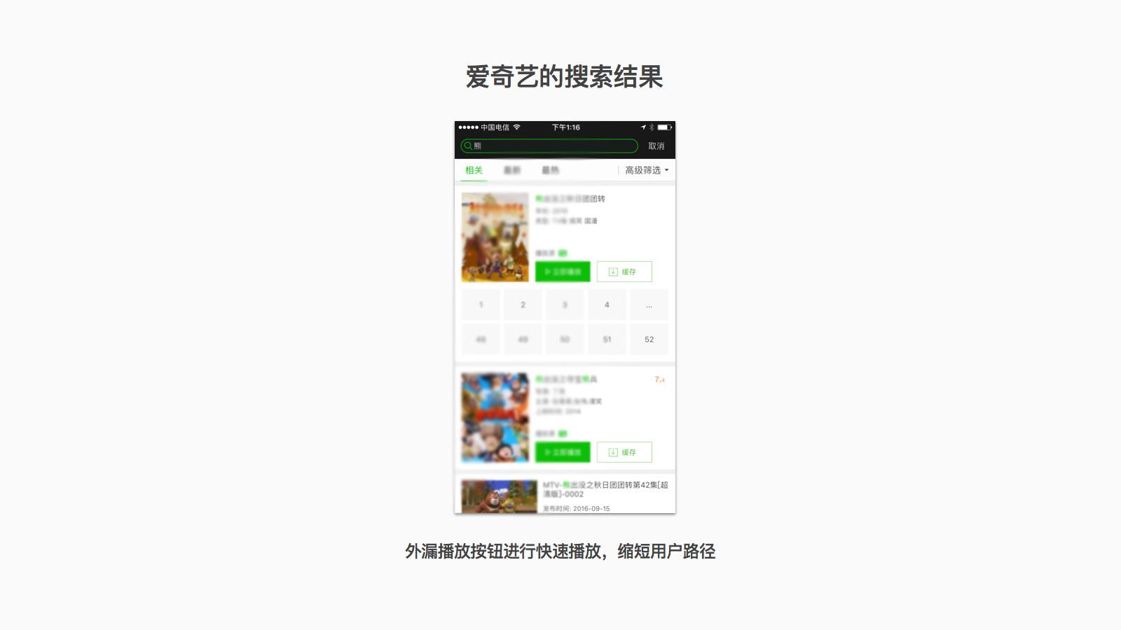 依據(jù)用戶的需求目的,在搜索結(jié)果的列表上我們可以外漏用戶大部分情況下會采取的操作,比如說視頻類網(wǎng)站,用戶搜索到某一內(nèi)容后,最常采取的操作就是播放,我們就可以把播放按鈕外漏,縮短用戶的操作路徑(如下圖愛奇藝的搜索結(jié)果頁)