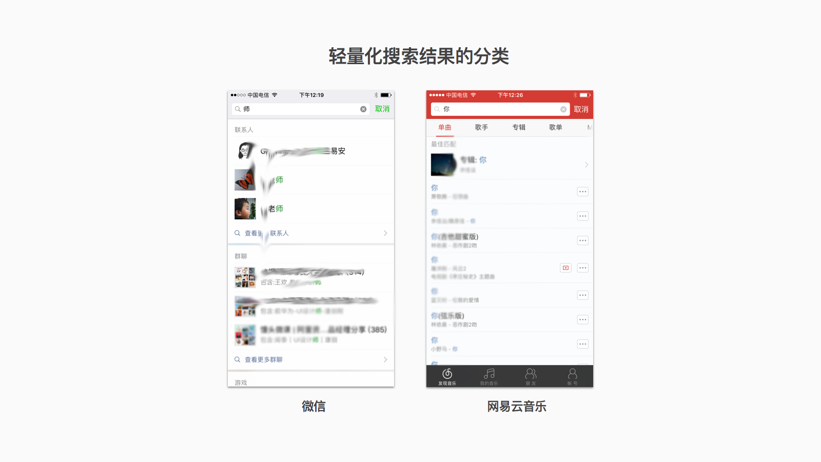 這兩種方式有各自的應(yīng)用場景,TAB切主要應(yīng)用在搜索結(jié)果有固定的幾種分類,并且通常的情況下搜索結(jié)果都有很多的內(nèi)容,如上圖的網(wǎng)易云音樂,每一個分類都有很多的搜索結(jié)果,如果它采用卡片式的瀑布流布局,用戶需要不停往下翻才能看到第二種分類的內(nèi)容。卡片式主要運用在搜索結(jié)果的內(nèi)容不多,如微信這樣的情況,每一類結(jié)果并不是很多,卡片式的瀑布流布局能讓用戶快速定位到自己想要的內(nèi)容,如果這里用TAB切就很尷尬了,因為每一類的內(nèi)容都很少或者很多類里根本沒有內(nèi)容,這樣的用戶感受就不好了。