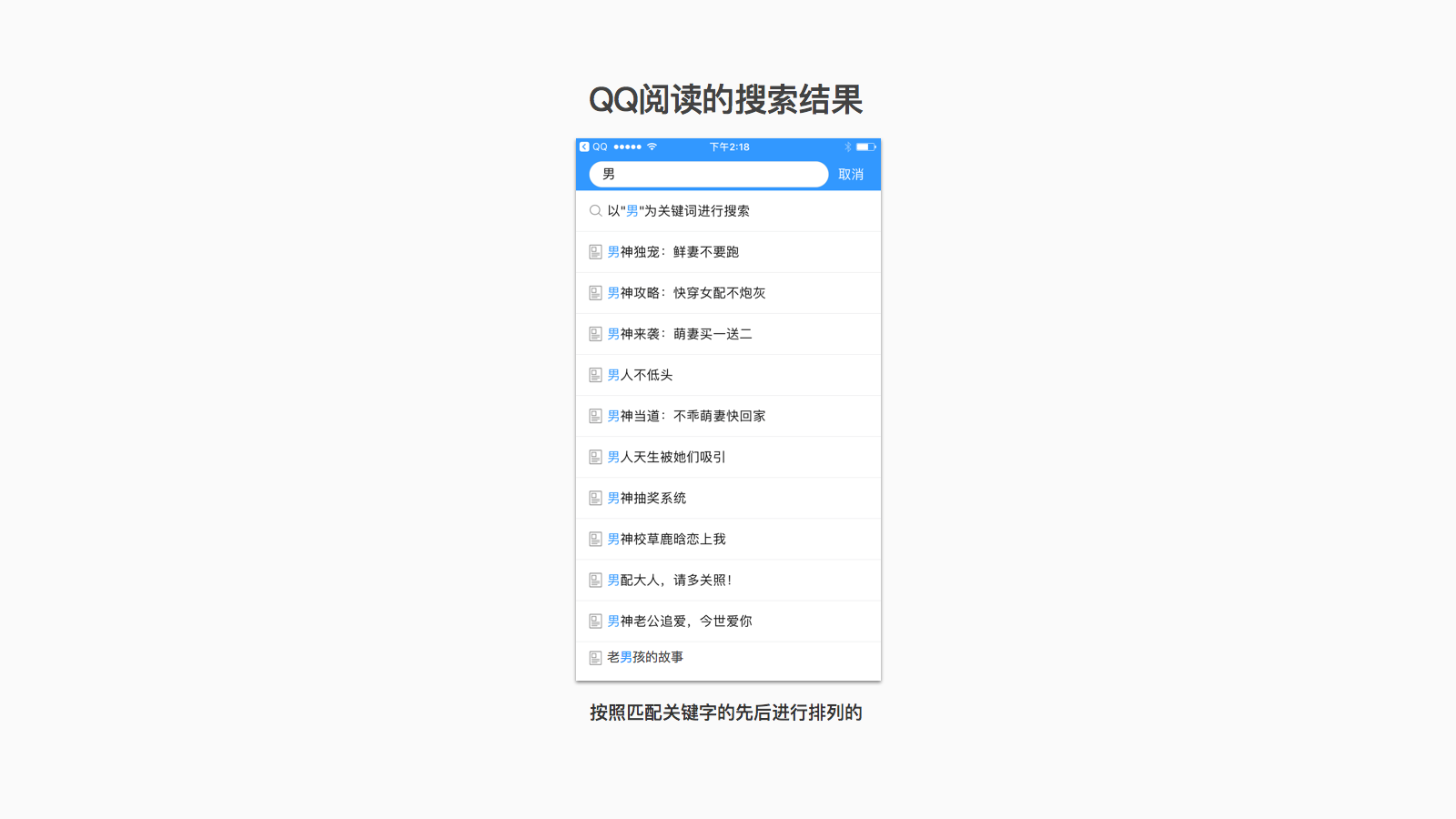 如下圖是說我在QQ閱讀輸入一個“男”字,然后就給我建議第一個字是“男”的所有可能的結(jié)果,當(dāng)?shù)谝粋€字匹配完后就匹配第二個字,這樣以此類推。他們的整體順序就是按照匹配關(guān)鍵字的先后進(jìn)行排列的,其實在排序中還牽涉了很多的算法,比如說它可能會摻雜一些“熱度、人氣、人為意圖、語義”等因素的權(quán)重,這里不展開贅述了。