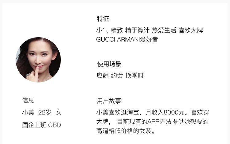 比如我們現(xiàn)在要設(shè)計(jì)一個(gè)女裝購物應(yīng)用,那么我們可以做這個(gè)用戶畫像:小美,在北京國貿(mào) CBD 上班,21歲,收入8000,喜歡淘寶購物和電視購物。使用我們產(chǎn)品的目的是為了尋找正品時(shí)尚大牌服裝進(jìn)行網(wǎng)購。