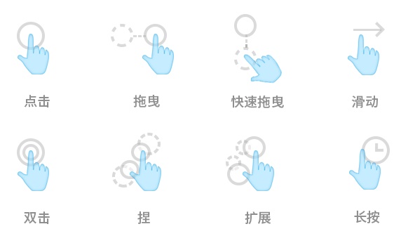 網(wǎng)頁設(shè)計(jì)所處的電腦端目前主要還是依靠鼠標(biāo)點(diǎn)擊來操作。鼠標(biāo)點(diǎn)擊的最小單位甚至可以是一像素。而移動(dòng)端不太一樣,移動(dòng)端設(shè)備中我們使用手指來操作界面。一般來說,手指點(diǎn)觸區(qū)域最小尺寸為7×7mm,拇指最小尺寸為9×9mm。也就是在我們@2x設(shè)計(jì)中為88px(或44pt)。這個(gè)神奇的88PX在移動(dòng)端應(yīng)用很廣泛:很多表單單項(xiàng)的高度是88px、導(dǎo)航欄高度也是88px等等。那您可能會說,也不對吧,有些界面上的圖標(biāo)看上去沒有88px啊。是的,但是那只是視覺,我們可以通過增加圖標(biāo)點(diǎn)擊區(qū)域的方式(比如給60像素大小的圖標(biāo)左右增加22像素的透明區(qū)域)來讓圖標(biāo)更好點(diǎn)擊。千萬在設(shè)計(jì)時(shí)不要把操作區(qū)域放得特別近,可以把所有點(diǎn)擊區(qū)域用88px標(biāo)記看是否有重疊的情況,避免點(diǎn)擊一個(gè)圖標(biāo)時(shí)誤點(diǎn)另一個(gè)圖標(biāo)。除了點(diǎn)擊區(qū)域,移動(dòng)端還可以利用各種手勢來進(jìn)行各種操作的設(shè)計(jì)。主要的手勢有: