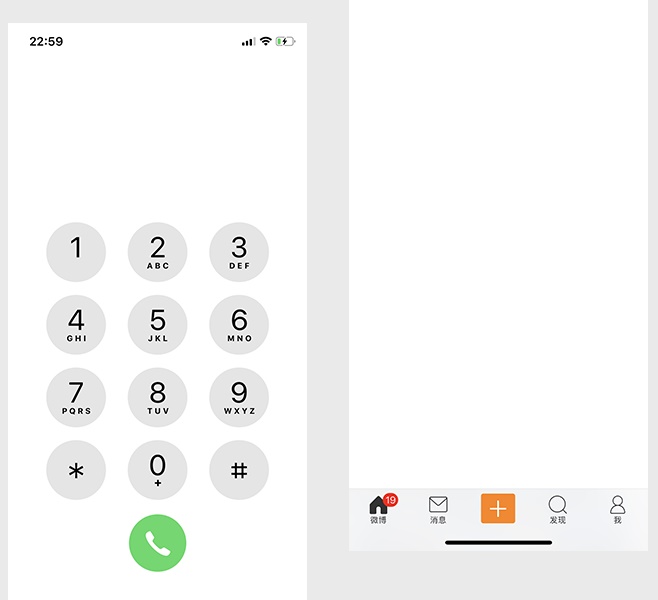 △ 撥號頁面中撥號鍵與微博發(fā)布微博圖標(biāo)都與其他按鈕不同