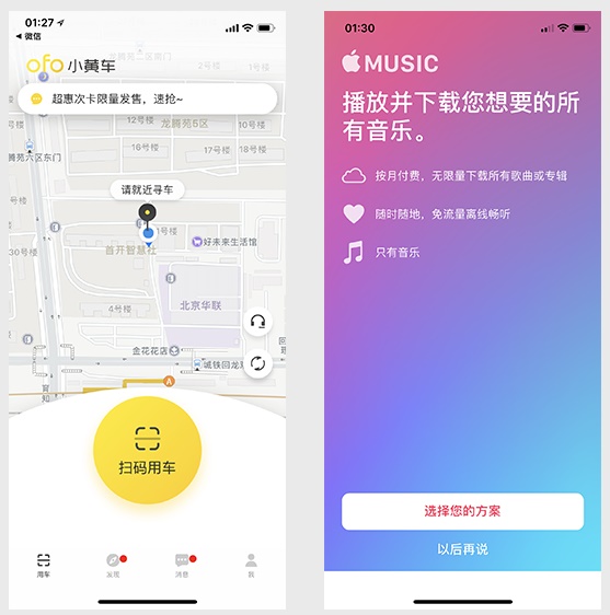 △ OFO 和蘋果音樂APP 都將按鈕放置手指最容易點(diǎn)擊的區(qū)域并且按鈕足夠大