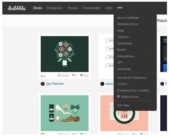 △ Dribbble 網(wǎng)站導(dǎo)航將更多功能收起在一個(gè)表示更多的圖標(biāo)內(nèi)