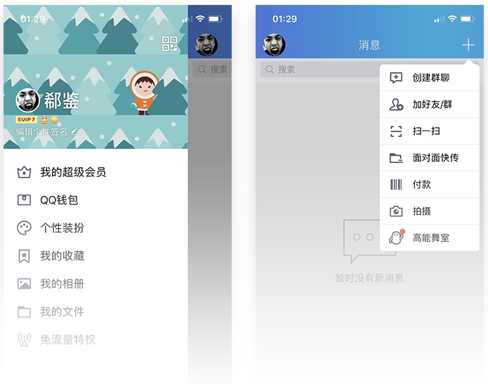 △ QQ 將更多功能收起到了頭像和加號圖標(biāo)中