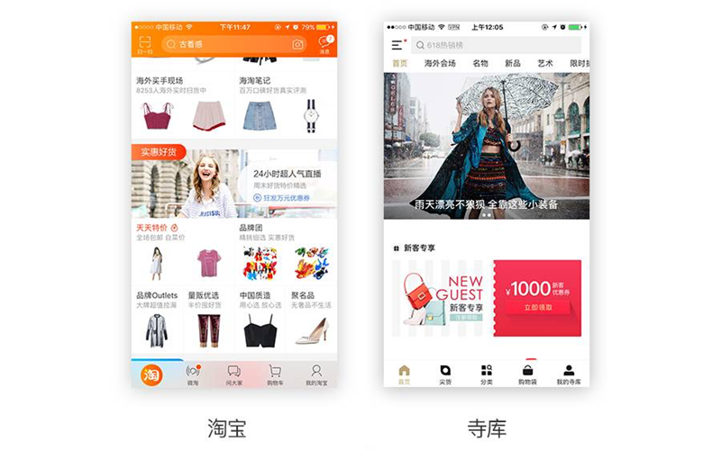 比如,同樣是購物平臺:淘寶,寺庫。設(shè)計風(fēng)格截然不同,寺庫看起來更簡潔高端,那能說淘寶不是好設(shè)計嗎?