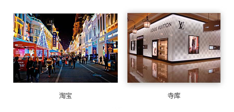 寺庫,是高端的奢侈品商場,給人尊貴奢華的感受。而淘寶,是符合大眾消費水平的步行街,你可以走走停停到處逛逛,淘一些自己喜歡的東西。