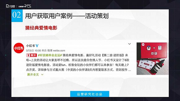 之前有很多做電商的同學(xué)會(huì)很好奇,“怎么讓用戶、讓已經(jīng)購(gòu)買的用戶幫忙做傳播,讓他曬單?”比較常見的做法是像京東這樣的通過(guò)給用戶發(fā)優(yōu)惠券,讓他們曬單參與抽獎(jiǎng)。而小紅書這個(gè)快遞盒就做的比較好玩,小紅書的快遞盒本身就非常有特色,每次周年慶會(huì)出一套快遞盒子,這種slogan盒,用戶收到盒子都會(huì)非常愿意分享。除了用這種創(chuàng)意的slogan之外,小紅書在今年3月份的時(shí)候還做了一個(gè)活動(dòng)叫做猜歌,猜電影。每個(gè)盒子里面手繪一些畫面讓用戶猜這個(gè)電影,然后以微博話題的方式叫用戶拿到這個(gè)盒子發(fā)微博并@小紅書猜電影 ,參與這個(gè)話題的討論。參與這個(gè)話題討論的用戶,它會(huì)每天從猜對(duì)的同學(xué)中選出3名的用戶來(lái)免費(fèi)的獲得小紅書的一些禮品。這個(gè)話題目前的整個(gè)閱讀量有七千多萬(wàn),效果還是蠻好的。小紅書在3月份整整做了兩期,由此可見,通過(guò)用戶在社交平臺(tái)上的這種分享還是能夠比較好的達(dá)到品牌上的傳播和用戶上獲取的效果的。