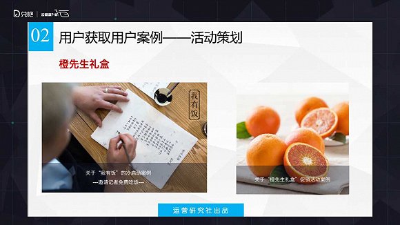 這是天天果園策劃的一個(gè)案例。用戶其實(shí)會(huì)分很多類的,有些用戶除了買之外,還有傳播的價(jià)值,那這種用戶我們往往把他稱之為是一種QL(???不確定)用戶。橙先生禮盒當(dāng)時(shí)策劃這個(gè)活動(dòng)的時(shí)候把QL發(fā)揮到了極致。第一點(diǎn)他找了一個(gè)在新媒體圈玩得比較溜的QL,這個(gè)人除了本身是領(lǐng)袖之外,還認(rèn)識(shí)很多小的ET(???也不確定)領(lǐng)袖,通過(guò)這個(gè)QL,給其他小的QL發(fā)橙先生禮盒的禮券。那這些小的QL拿到這個(gè)券可以干什么呢?可以免費(fèi)兌換橙先生的禮盒,價(jià)值大概100多塊錢。當(dāng)我們拿到這個(gè)禮盒之后,直接跟天天果園對(duì)接的這個(gè)QL,會(huì)私聊我們問(wèn):你的禮盒有沒(méi)有收到?收到的話你方不方便把這個(gè)東西分享到朋友圈?