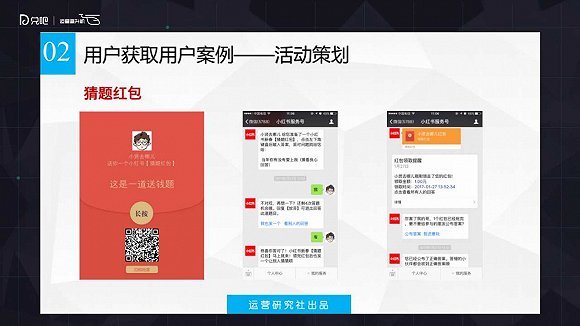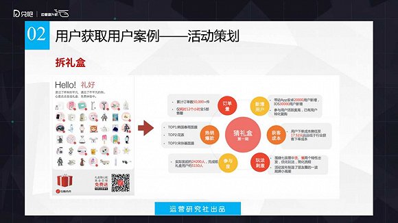 一個(gè)電商品牌的獲客成本二十幾元是非常低的,電商平臺(tái)獲客成本基本上都是要至少要兩百的一個(gè)情況。通過(guò)這個(gè)活動(dòng),通過(guò)用戶獲取用戶這個(gè)方式把這個(gè)成本降到二十幾塊錢一個(gè)。像類似這種拆禮盒的這種案例目前在微信上用的特別多,有類似的免費(fèi)聽課,你可以把這個(gè)東西分享給用戶,只要有兩個(gè)用戶關(guān)注這個(gè)服務(wù)好,你就可以免費(fèi)來(lái)聽課。這個(gè)是屬于相類似的一個(gè)通過(guò)用戶獲取用戶的一些小的方法。