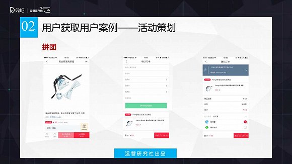 有很多第三方的平臺(tái),很多電商平臺(tái)在做拼團(tuán)。關(guān)于拼團(tuán),我的建議是不要把它當(dāng)是一個(gè)活動(dòng),它是一個(gè)比較好的用戶獲取的方式。像“拼多多”,目前整個(gè)估值,包括APP下載量都還蠻不錯(cuò)的,拼團(tuán)的方式是病毒式的獲客,其實(shí)是非常好的。你在拼團(tuán)的時(shí)候可以把用戶獲取成本算到你拼團(tuán)的案例里,是比平常買用戶,單純購(gòu)買用戶更便宜的,這個(gè)是更加需要思考的。