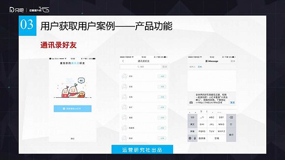 很多做社交功能的產(chǎn)品都可以通過(guò)這種方式獲取用戶。“通訊錄好友”能夠快速把用戶現(xiàn)在這部手機(jī)里面的通訊錄好友抓到你產(chǎn)品里面,讓你的用戶給他通訊錄的好友發(fā)一些邀請(qǐng),進(jìn)而成為你的用戶。這個(gè)功能是屬于非常傳統(tǒng)、有效的一個(gè)功能,很多產(chǎn)品都在用。像人人網(wǎng),人人網(wǎng)早期起來(lái)的時(shí)候也都是通過(guò)高校與高校的之間好友的邀請(qǐng)達(dá)到傳播的。人人網(wǎng)雖然死了,但是也動(dòng)不動(dòng)會(huì)往我們郵箱發(fā)一些郵件。可見通訊錄好友這種獲取用戶的方式其實(shí)效果是蠻不錯(cuò)的,這種功能也都是大家可能嘗試添加的。如果說(shuō)你有這種功能之后,還可以通過(guò)策劃一些活動(dòng),比如說(shuō)好友邀請(qǐng)的PK,也都是一種不錯(cuò)的方式。