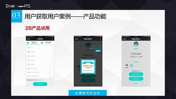 于是,它做了一個(gè)試用版。如果你想用到這些功能,可以用,但是有一個(gè)要求就是你必須到我的服務(wù)號(hào)來(lái)發(fā)起這個(gè)社群,然后創(chuàng)建這個(gè)社群,創(chuàng)建這個(gè)社群你想要激活它還有一個(gè)要求,就是你必須拉滿50個(gè)社群的公眾用戶才可以激活它。當(dāng)這50個(gè)社群用戶被他拉來(lái)的時(shí)候,就已經(jīng)變成服務(wù)號(hào)的粉絲了。這就是一個(gè)通過(guò)功能的免費(fèi)試用獲得用戶的一個(gè)技巧跟案例,如果說(shuō)你的業(yè)務(wù)面向B端的話。