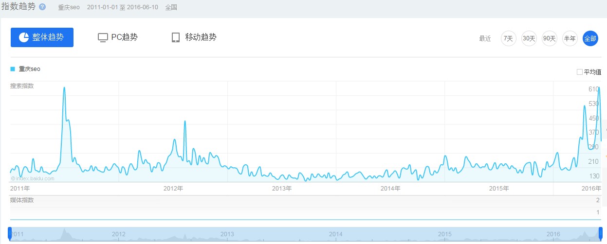 百度指數(shù)是用以反映關鍵詞在過去30天內的網(wǎng)絡曝光率及用戶關注度!它能形象地反映該關鍵詞的每天的變化趨勢! 對于站長來說,掌握搜索引擎的關鍵詞網(wǎng)絡曝光率十分重要,百度指數(shù)是一個很好的突破口。百度根據(jù)某段時間內,某個關鍵詞用戶的搜索量的高低而給予這個關鍵詞一個熱度數(shù)值。如果這個關鍵詞用戶通過百度搜索次數(shù)非常多的時候,這個百度指數(shù)值就會越高。如果搜索次數(shù)減少了,相應的這個詞的指數(shù)也會降低。任何一個關鍵詞的百度指數(shù)都不是固定的,是隨著用戶搜索量的變化而不斷變化的。例如:王思聰罵女主播,鄧超跑男,電影魔獸等等一些具有時效性的詞,在一段時間內搜索量是非常高的,相應的百度指數(shù)也會非常高。過了時效時間后。關注這些話題的人都越來越少。相應的,這些詞的百度指數(shù)也就會下降。