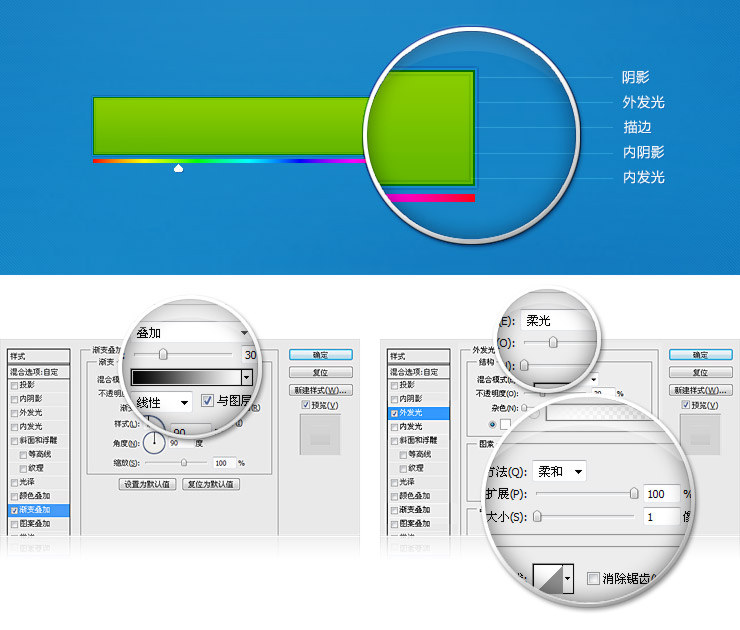通過混合選項中的'陰影、外發(fā)光、描邊(不適用疊柔法)、內(nèi)陰影、內(nèi)發(fā)光'可以自由的刻畫5層像素級細(xì)節(jié)(當(dāng)然,通常在實際的使用中刻畫1到3層即可)。