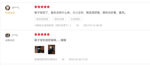那么真正的高質(zhì)量評(píng)價(jià)是要解決用戶擔(dān)憂,除了“質(zhì)量不錯(cuò)”,“商品很贊”之外,高質(zhì)量的評(píng)價(jià)是具體到產(chǎn)品細(xì)節(jié),評(píng)價(jià)里若有“鞋的尺碼略有偏大,建議買小一碼的。”(如下圖,這兩條評(píng)價(jià)都是好評(píng),但是意義完全不一樣。)