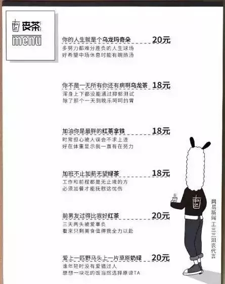 最近有一種“負能量”品牌挺火,比如,臺灣月葉奶茶推出4款“消極杯”,在奶茶杯蓋上赫然印著“體重不會因為少喝一杯飲料就變輕”、“好東西就應該跟好朋友分享,啊,我忘了我沒有朋友”等充滿負能量的話語。餓了么和網(wǎng)易新聞聯(lián)合出品的頗具事件營銷意味的“喪茶”,更是從奶茶命名上就充滿了負能量,比如有售價18元的“你不是一無所有你還有病啊烏龍茶”、20元的“前男友過得比我好紅茶”等。