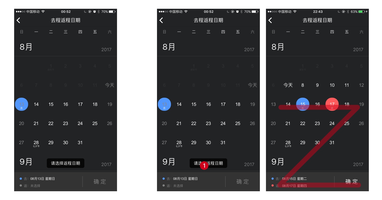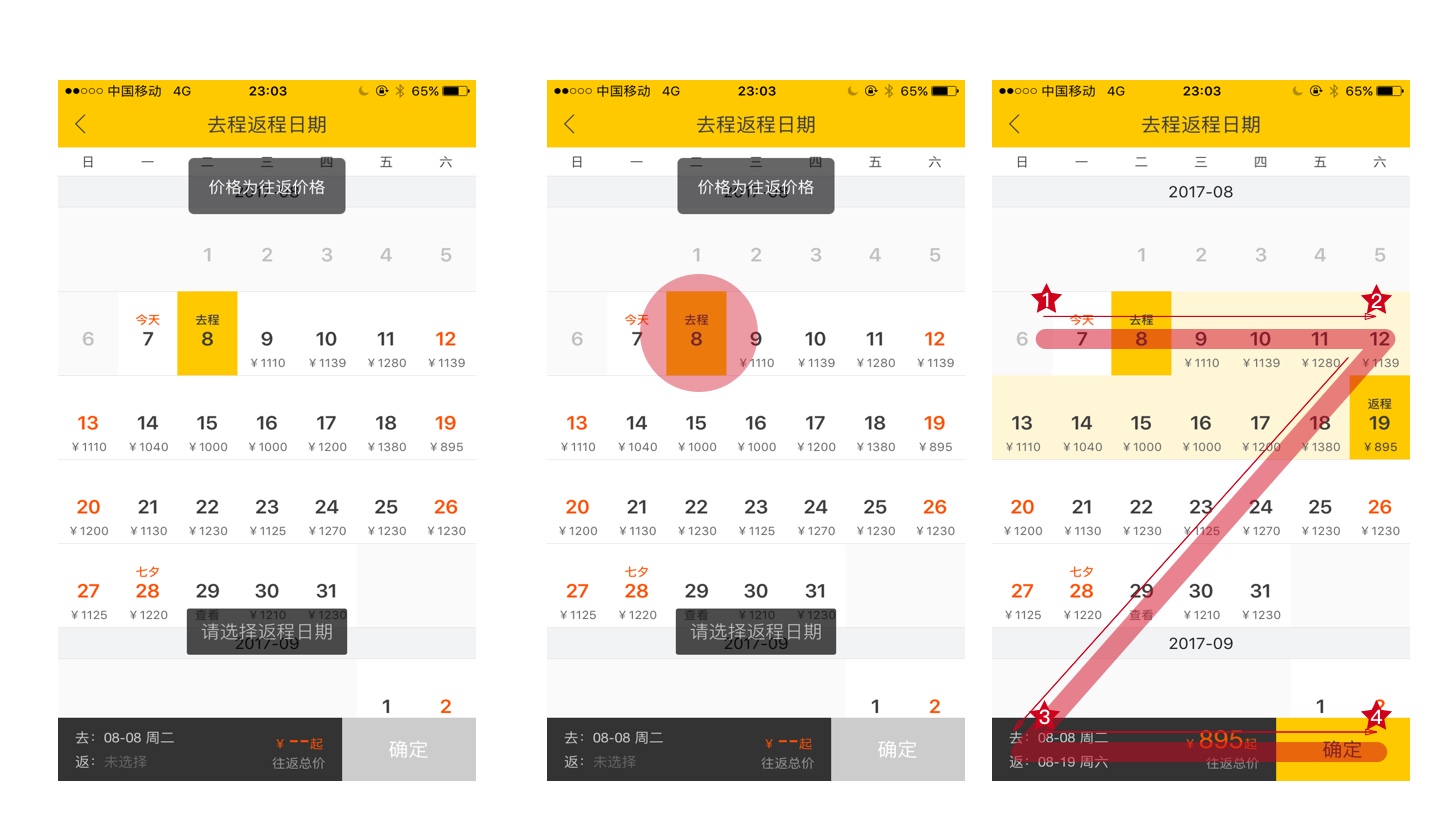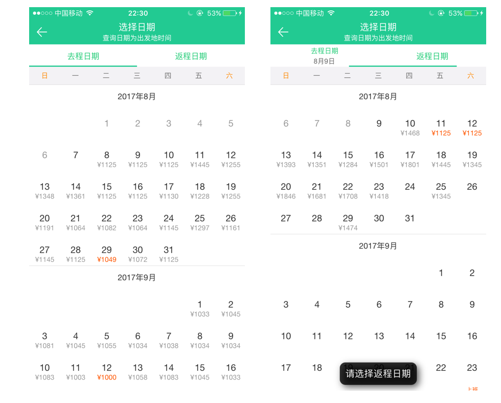 左邊應(yīng)用的設(shè)計(jì)讓我跳轉(zhuǎn)后很疑惑,到底我剛剛出發(fā)選了什么,沒有反饋,也不知道對(duì)不可選的定義是什么,為什么出發(fā)選了24號(hào),跳轉(zhuǎn)到返程以后24號(hào)前的依舊可選。而在右邊的應(yīng)用中則有很好的信息反饋設(shè)計(jì)。