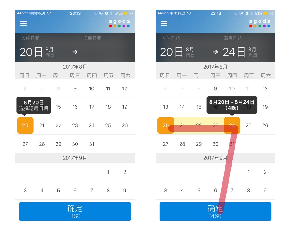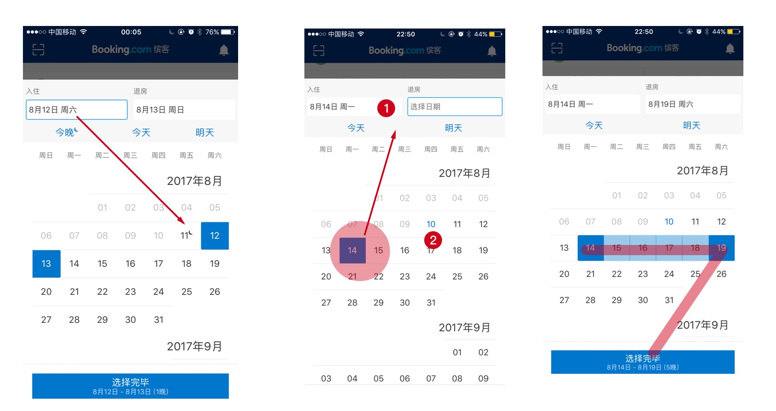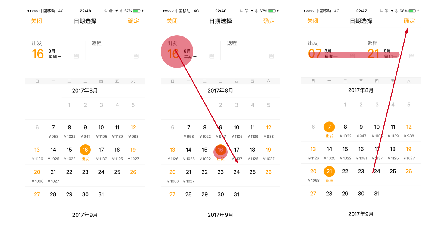 左邊應(yīng)用的設(shè)計(jì)讓我跳轉(zhuǎn)后很疑惑,到底我剛剛出發(fā)選了什么,沒有反饋,也不知道對(duì)不可選的定義是什么,為什么出發(fā)選了24號(hào),跳轉(zhuǎn)到返程以后24號(hào)前的依舊可選。而在右邊的應(yīng)用中則有很好的信息反饋設(shè)計(jì)。