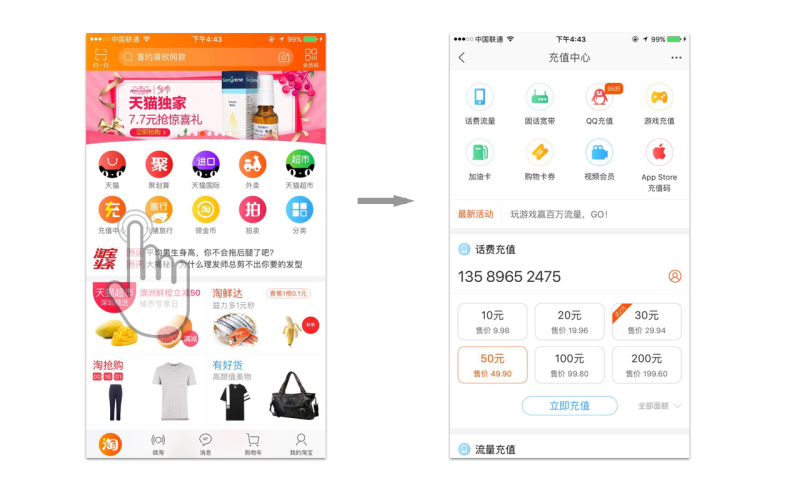 (由于項(xiàng)目沒(méi)上線,不能展示設(shè)計(jì)稿,所以可以用競(jìng)品淘寶的【充值中心】來(lái)闡述這個(gè)思考過(guò)程)