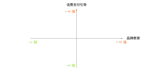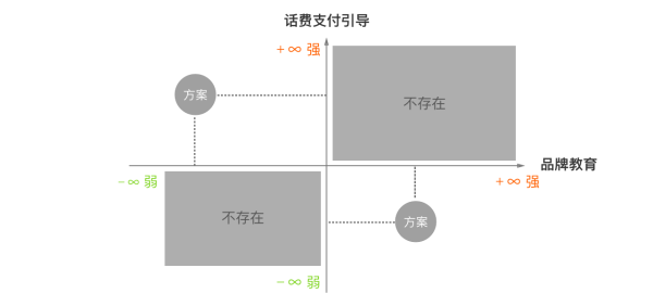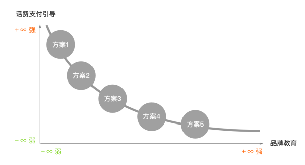 聰明的你一定會(huì)發(fā)現(xiàn),既然“話(huà)費(fèi)支付引導(dǎo)”與“品牌教育”是相反的變量,那么完全可以將二維矩陣圖變形,變成反比例函數(shù)圖像。
