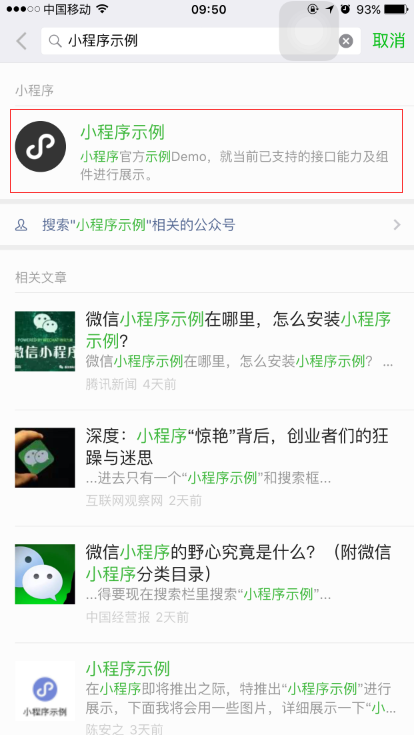 2、在微信的⑴個頁面頂端,有一個搜索條,在搜索條里輸入:小程序示例,然后點(diǎn)擊搜索。