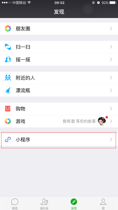 5、退出上面這個頁面,點(diǎn)開你的微信第三頁面“發(fā)現(xiàn)”,你會發(fā)現(xiàn),再出現(xiàn)面出現(xiàn)了小程序的入口。
