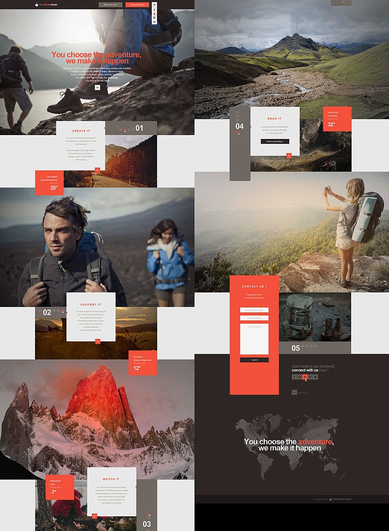 下面是一個(gè)旅行網(wǎng)頁(yè)。整個(gè)網(wǎng)站用了大面積的方形元素,利用這些方形的大小和改變長(zhǎng)寬比例來(lái)錯(cuò)列排版,使得整個(gè)網(wǎng)頁(yè)信息分類明確,節(jié)奏感十足。