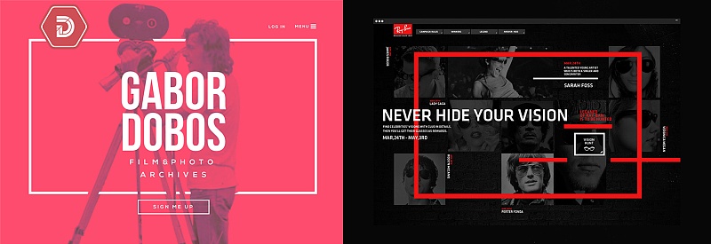 以下網(wǎng)站是左側(cè)一個(gè)男模特的網(wǎng)站,整個(gè)banner采用了紅色調(diào),設(shè)計(jì)師為了讓用戶快速往下瀏覽,所有大膽的添加了紅色系的方框,有效的引導(dǎo)了用戶的視覺(jué),從上而下的瀏覽,同時(shí)使得整個(gè)畫面不會(huì)出現(xiàn)頭重腳輕的問(wèn)題。另外這樣的處理讓整個(gè)版面設(shè)計(jì)上更加新穎,使得作品脫穎而出。
