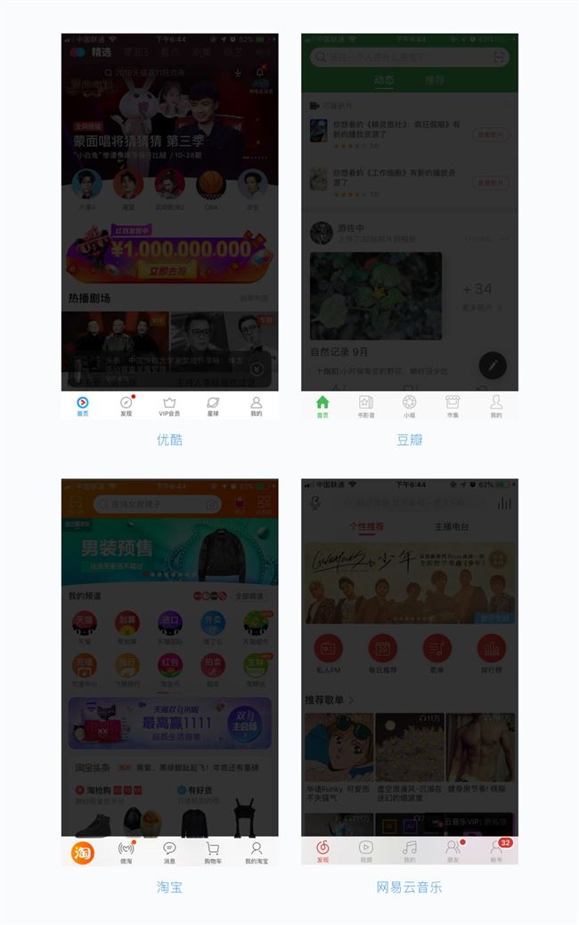 底部導(dǎo)航欄設(shè)計(jì)是我們最常見的導(dǎo)航模式之一,位于頁面底部,用于一級頁面當(dāng)中負(fù)責(zé)各主業(yè)務(wù)模塊的切換,一般會保持3~ 5 個標(biāo)簽,適用于頻繁切換業(yè)務(wù)模塊的產(chǎn)品。例如優(yōu)酷、豆瓣、淘寶、網(wǎng)易云音樂: