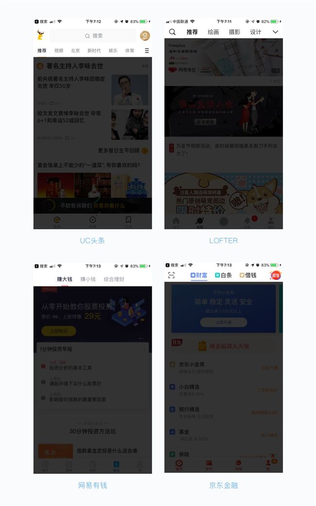頂部導(dǎo)航欄位于頁面頂部,一般位于導(dǎo)航欄或者狀態(tài)欄下方,用作于二級導(dǎo)航,基本都以純文字的形式出現(xiàn)(避免干擾用戶瀏覽頁面核心內(nèi)容),常見的頂部導(dǎo)航欄有:固定頂部標(biāo)簽導(dǎo)航&可滑動標(biāo)簽導(dǎo)航。例如uc頭條、lofter、網(wǎng)易有錢、京東金融: