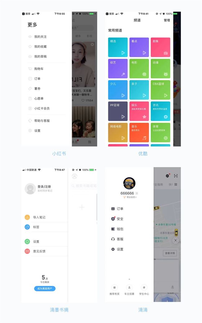 側(cè)邊欄導(dǎo)航是除了核心功能意外的主要功能全部隱藏在側(cè)邊欄里,一般通過點(diǎn)擊左上角的 icon 彈出,左側(cè)區(qū)域現(xiàn)實(shí)導(dǎo)航中的內(nèi)容。例如小紅書、優(yōu)酷、滴墨書摘、滴滴: