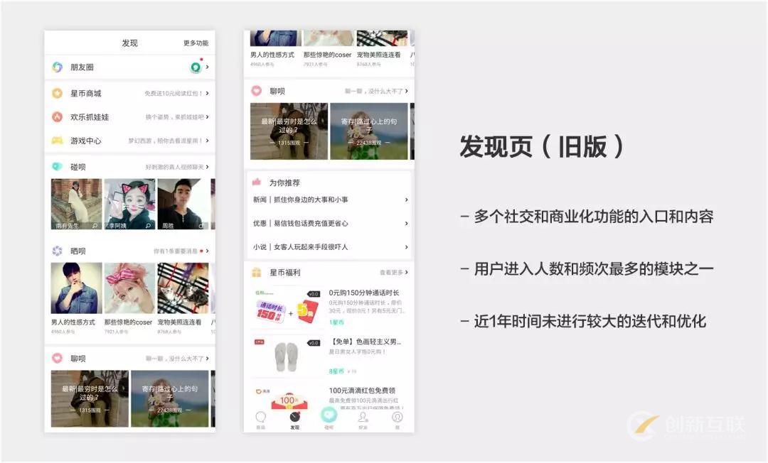 易信發(fā)現(xiàn)頁匯聚了多個(gè)社交和商業(yè)化功能的入口和內(nèi)容,是易信用戶進(jìn)入人數(shù)和頻次最多的模塊之一。但是,在近 1 年的時(shí)間未做較大迭代后,很多問題也漸漸凸顯。因此,我們進(jìn)行了以最低成本和數(shù)據(jù)來驅(qū)動(dòng)的設(shè)計(jì)改版,讓發(fā)現(xiàn)頁能夠繼續(xù)更好地為用戶服務(wù),同時(shí)能夠提升用戶對各個(gè)社交模塊的使用。