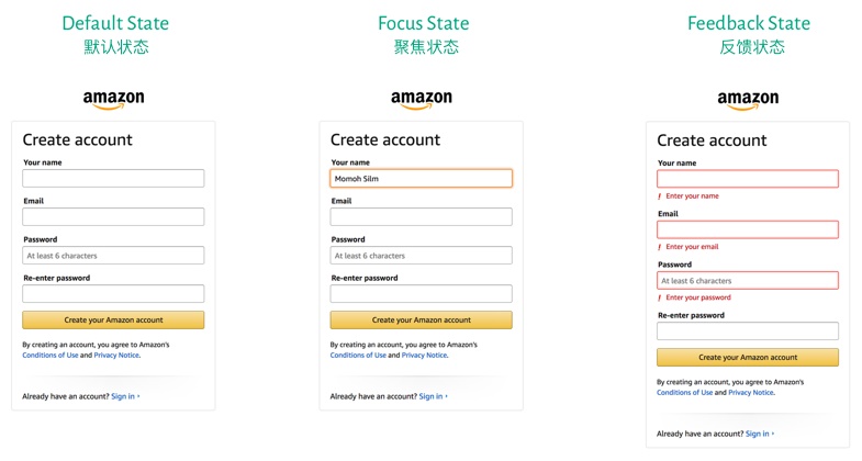 △ Amazon創(chuàng)建賬戶(hù)表單的「默認(rèn)、聚焦、反饋」頁(yè)面狀態(tài)