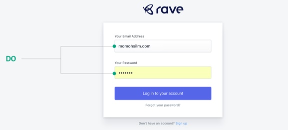 △ Flutterwave’s Rave的登錄頁(yè)面,輸入?yún)^(qū)域的尺寸與預(yù)期的輸入字段的長(zhǎng)度比例一致
