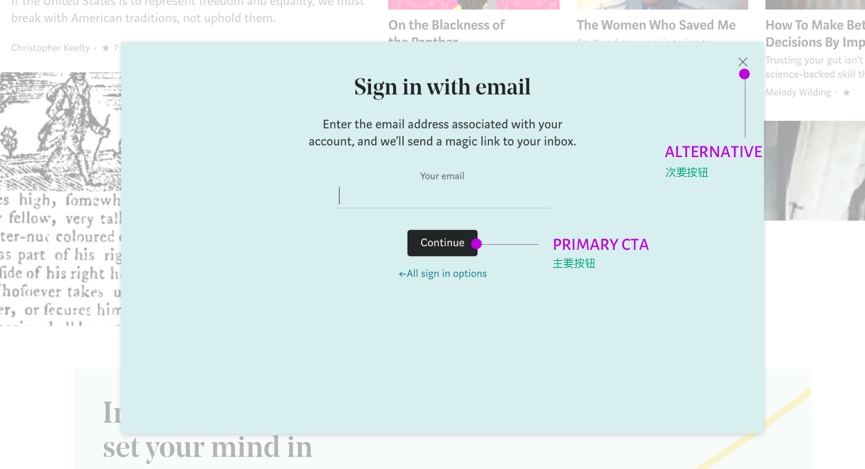 △ Medium的登錄模態(tài)彈窗使用X icon 來(lái)代表關(guān)閉按鈕