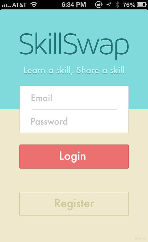 這個(gè)app登錄注冊(cè)界面設(shè)計(jì),漸變色背景加醒目的黃色按鈕,同樣與logo呼應(yīng)。